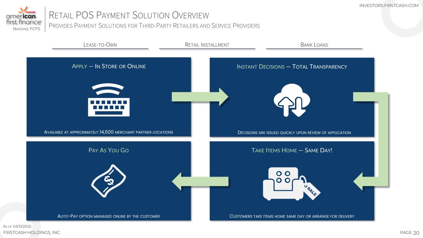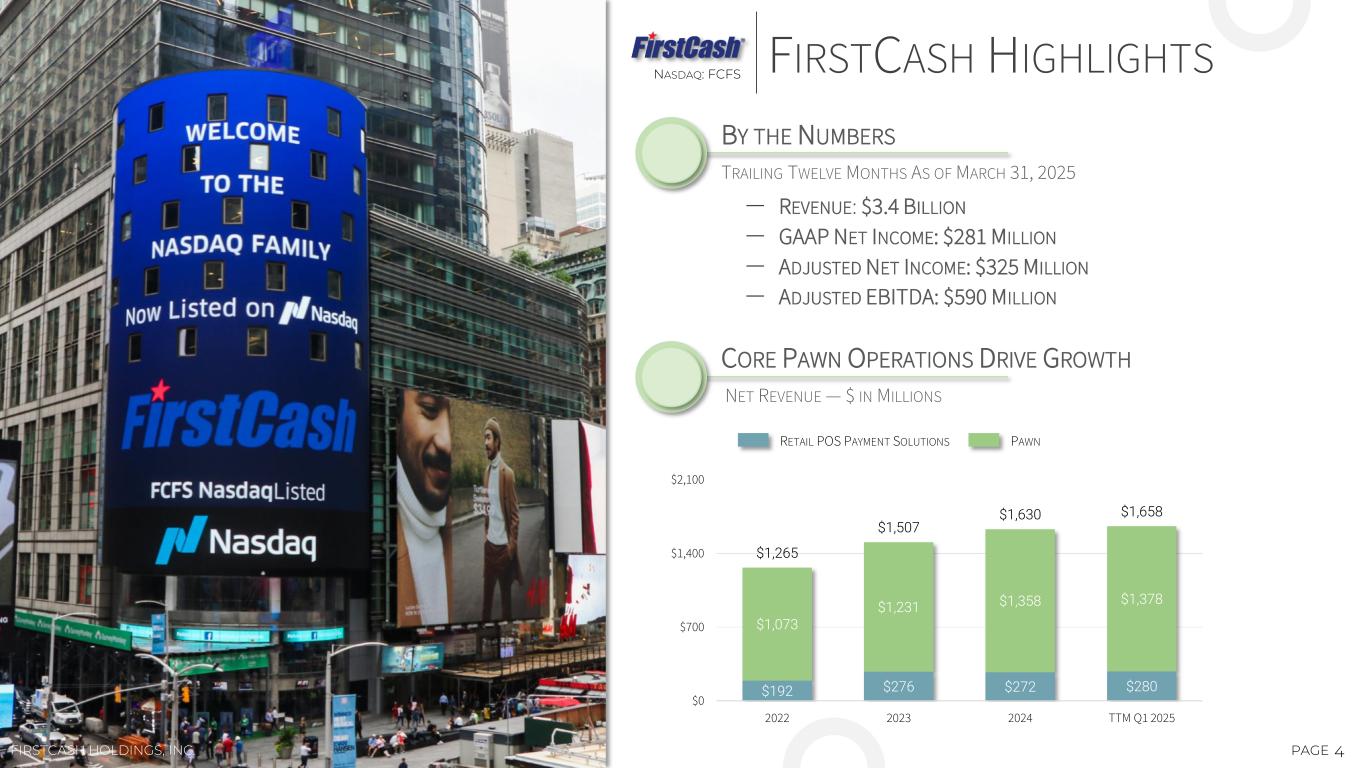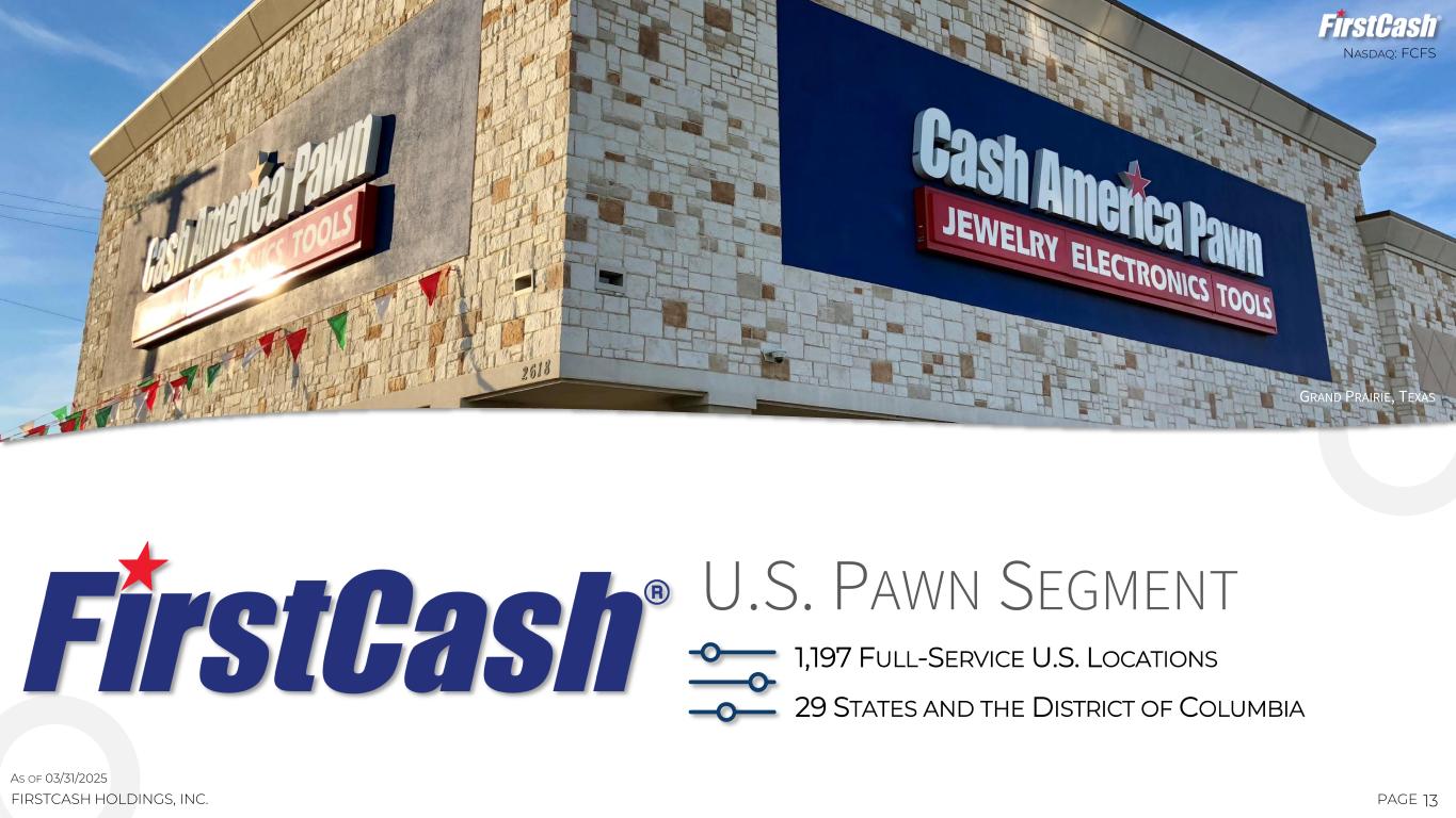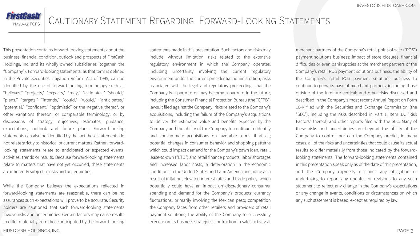 This presentation contains forward-looking statements about the business, financial condition, outlook and prospects of FirstCash Holdings, Inc. and its wholly owned subsidiaries (together, the “Company”). Forward-looking statements, as that term is defined in the Private Securities Litigation Reform Act of 1995, can be identified by the use of forward-looking terminology such as “believes,” “projects,” “expects,” “may,” “estimates,” “should,” “plans,” “targets,” “intends,” “could,” “would,” “anticipates,” “potential,” “confident,” “optimistic” or the negative thereof, or other variations thereon, or comparable terminology, or by discussions of strategy, objectives, estimates, guidance, expectations, outlook and future plans. Forward-looking statements can also be identified by the fact these statements do not relate strictly to historical or current matters. Rather, forward- looking statements relate to anticipated or expected events, activities, trends or results. Because forward-looking statements relate to matters that have not yet occurred, these statements are inherently subject to risks and uncertainties. While the Company believes the expectations reflected in forward-looking statements are reasonable, there can be no assurances such expectations will prove to be accurate. Security holders are cautioned that such forward-looking statements involve risks and uncertainties. Certain factors may cause results to differ materially from those anticipated by the forward-looking statements made in this presentation. Such factors and risks may include, without limitation, risks related to the extensive regulatory environment in which the Company operates, including uncertainty involving the current regulatory environment under the current presidential administration; risks associated with the legal and regulatory proceedings that the Company is a party to or may become a party to in the future, including the Consumer Financial Protection Bureau (the “CFPB”) lawsuit filed against the Company; risks related to the Company’s acquisitions, including the failure of the Company’s acquisitions to deliver the estimated value and benefits expected by the Company and the ability of the Company to continue to identify and consummate acquisitions on favorable terms, if at all; potential changes in consumer behavior and shopping patterns which could impact demand for the Company’s pawn loan, retail, lease-to-own (“LTO”) and retail finance products; labor shortages and increased labor costs; a deterioration in the economic conditions in the United States and Latin America, including as a result of inflation, elevated interest rates and trade policy, which potentially could have an impact on discretionary consumer spending and demand for the Company’s products; currency fluctuations, primarily involving the Mexican peso; competition the Company faces from other retailers and providers of retail payment solutions; the ability of the Company to successfully execute on its business strategies; contraction in sales activity at merchant partners of the Company’s retail point-of-sale (“POS”) payment solutions business; impact of store closures, financial difficulties or even bankruptcies at the merchant partners of the Company’s retail POS payment solutions business; the ability of the Company’s retail POS payment solutions business to continue to grow its base of merchant partners, including those outside of the furniture vertical; and other risks discussed and described in the Company’s most recent Annual Report on Form 10-K filed with the Securities and Exchange Commission (the “SEC”), including the risks described in Part 1, Item 1A, “Risk Factors” thereof, and other reports filed with the SEC. Many of these risks and uncertainties are beyond the ability of the Company to control, nor can the Company predict, in many cases, all of the risks and uncertainties that could cause its actual results to differ materially from those indicated by the forward- looking statements. The forward-looking statements contained in this presentation speak only as of the date of this presentation, and the Company expressly disclaims any obligation or undertaking to report any updates or revisions to any such statement to reflect any change in the Company’s expectations or any change in events, conditions or circumstances on which any such statement is based, except as required by law. 2PAGE CAUTIONARY STATEMENT REGARDING FORWARD-LOOKING STATEMENTSNASDAQ: FCFS FIRSTCASH HOLDINGS, INC. INVESTORS.FIRSTCASH.COM