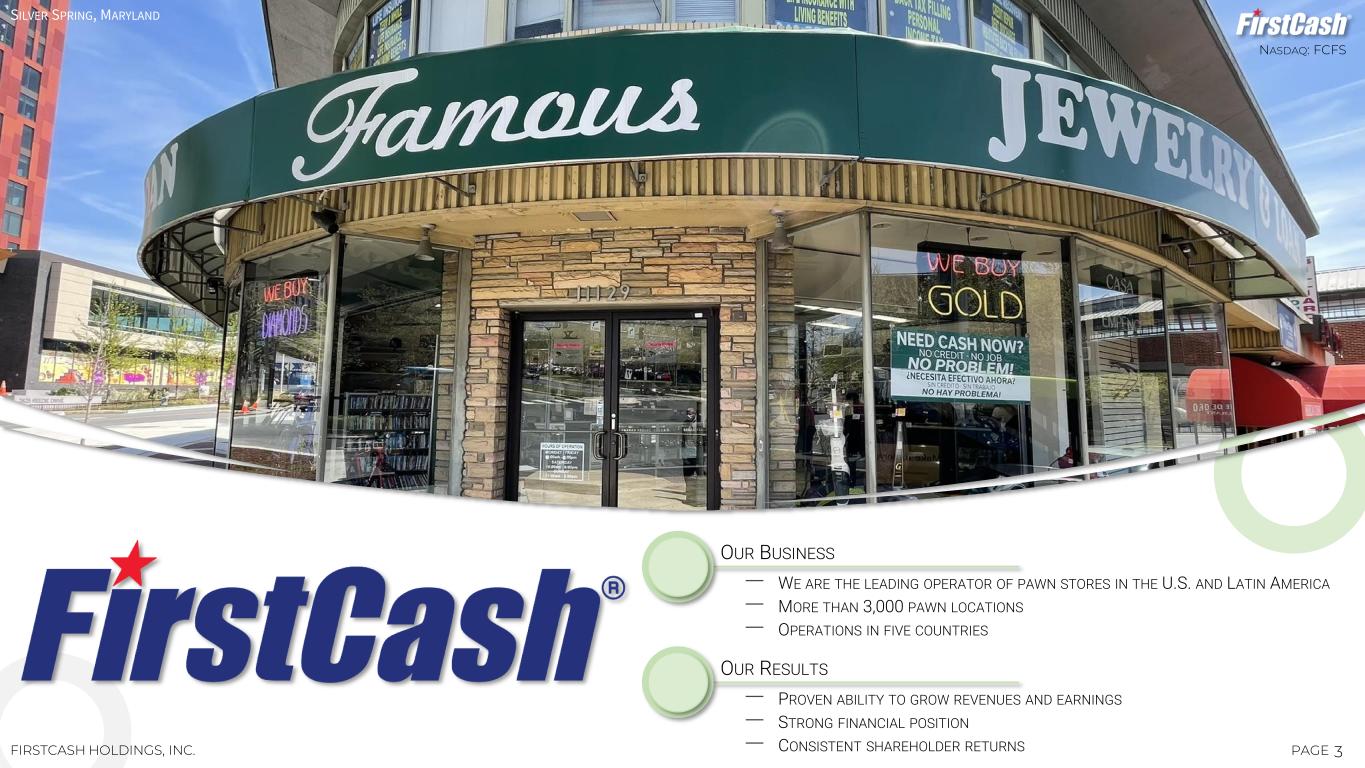 NASDAQ: FCFS 3PAGEFIRSTCASH HOLDINGS, INC. OUR BUSINESS ‒ WE ARE THE LEADING OPERATOR OF PAWN STORES IN THE U.S. AND LATIN AMERICA ‒ MORE THAN 3,000 PAWN LOCATIONS ‒ OPERATIONS IN FIVE COUNTRIES OUR RESULTS ‒ PROVEN ABILITY TO GROW REVENUES AND EARNINGS ‒ STRONG FINANCIAL POSITION ‒ CONSISTENT SHAREHOLDER RETURNS SILVER SPRING, MARYLAND