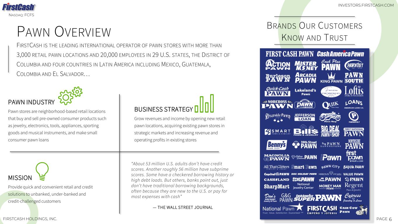 5PAGEFIRSTCASH HOLDINGS, INC. PAWN OPERATIONS NASHVILLE, TENNESSEE NASDAQ: FCFS INVESTORS.FIRSTCASH.COM