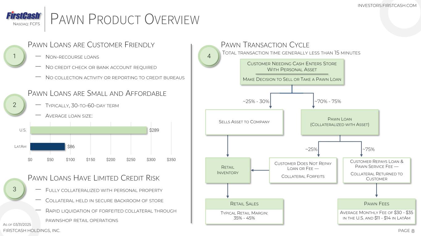 66 123 282 595 906 2,085 2,679 1988 1989 – 1996 1997 – 2001 2002 – 2005 2006 - 2010 2011 – 2013 2014 – 2016 2017 – 2019 2020 – Q1 2025 FIRSTCASH PAWN SEGMENT HISTORY PRIMARY LONG-TERM BUSINESS PLAN IS TO CONTINUE GROWING PAWN REVENUES AND INCOME BY OPENING NEW (“DE NOVO”) RETAIL PAWN LOCATIONS, ACQUIRING EXISTING PAWN STORES IN STRATEGIC MARKETS AND INCREASING REVENUE AND OPERATING PROFITS IN EXISTING STORES… 7PAGEFIRSTCASH HOLDINGS, INC. NASDAQ: FCFS FIRST ACQUIRED STORE SUITLAND, MD USA FIRST STORE 1988 HALTOM CITY, TX USA 100+ STORES IN MEXICO OVER 260 DE NOVO STORES OPENINGS 500TH LATAM STORE OPENED FIRST STORES IN MEXICO 100TH DE NOVO STORE WORLDWIDE 500TH DE NOVO STORE OPENED 300+ TOTAL STORES IN MEXICO CASH AMERICA MERGER: (OVER 800 U.S. STORES) MAXI PRENDA ACQUISITION: (FIRST STORES IN GUATEMALA & EL SALVADOR) 530+ STORE ACQUISITION FIRST STORES IN COLOMBIA 588 STORES ADDED SINCE 2020 319 NEW STORE OPENINGS AND 269 ACQUIRED SINCE 2017 — 1,365 PAWN STORES HAVE BEEN OPENED OR ACQUIRED 3,023 MILESTONE: MORE THAN 3,000 STORES INVESTORS.FIRSTCASH.COM AS OF 03/31/2025