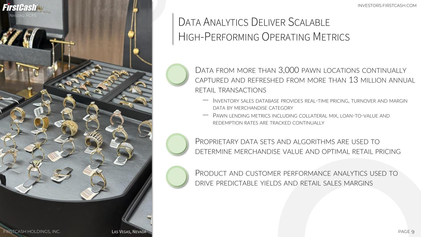 1 2 3 4 8PAGE PAWN PRODUCT OVERVIEWNASDAQ: FCFS FIRSTCASH HOLDINGS, INC. $86 $289 $0 $50 $100 $150 $200 $250 $300 $350 LATAM U.S. PAWN LOANS ARE CUSTOMER FRIENDLY ‒ NON-RECOURSE LOANS ‒ NO CREDIT CHECK OR BANK ACCOUNT REQUIRED ‒ NO COLLECTION ACTIVITY OR REPORTING TO CREDIT BUREAUS PAWN LOANS ARE SMALL AND AFFORDABLE ‒ TYPICALLY, 30-TO-60-DAY TERM ‒ AVERAGE LOAN SIZE: PAWN TRANSACTION CYCLE TOTAL TRANSACTION TIME GENERALLY LESS THAN 15 MINUTES PAWN LOANS HAVE LIMITED CREDIT RISK ‒ FULLY COLLATERALIZED WITH PERSONAL PROPERTY ‒ COLLATERAL HELD IN SECURE BACKROOM OF STORE ‒ RAPID LIQUIDATION OF FORFEITED COLLATERAL THROUGH PAWNSHOP RETAIL OPERATIONS TYPICAL RETAIL MARGIN: 35% - 45% AVERAGE MONTHLY FEE OF $30 - $35 IN THE U.S. AND $11 - $14 IN LATAM CUSTOMER DOES NOT REPAY LOAN OR FEE — COLLATERAL FORFEITS CUSTOMER REPAYS LOAN & PAWN SERVICE FEE — COLLATERAL RETURNED TO CUSTOMER ~25% - 30% ~70% - 75% CUSTOMER NEEDING CASH ENTERS STORE WITH PERSONAL ASSET MAKE DECISION TO SELL OR TAKE A PAWN LOAN ~25% ~75% SELLS ASSET TO COMPANY PAWN LOAN (COLLATERALIZED WITH ASSET) RETAIL INVENTORY RETAIL SALES PAWN FEES INVESTORS.FIRSTCASH.COM AS OF 03/31/2025