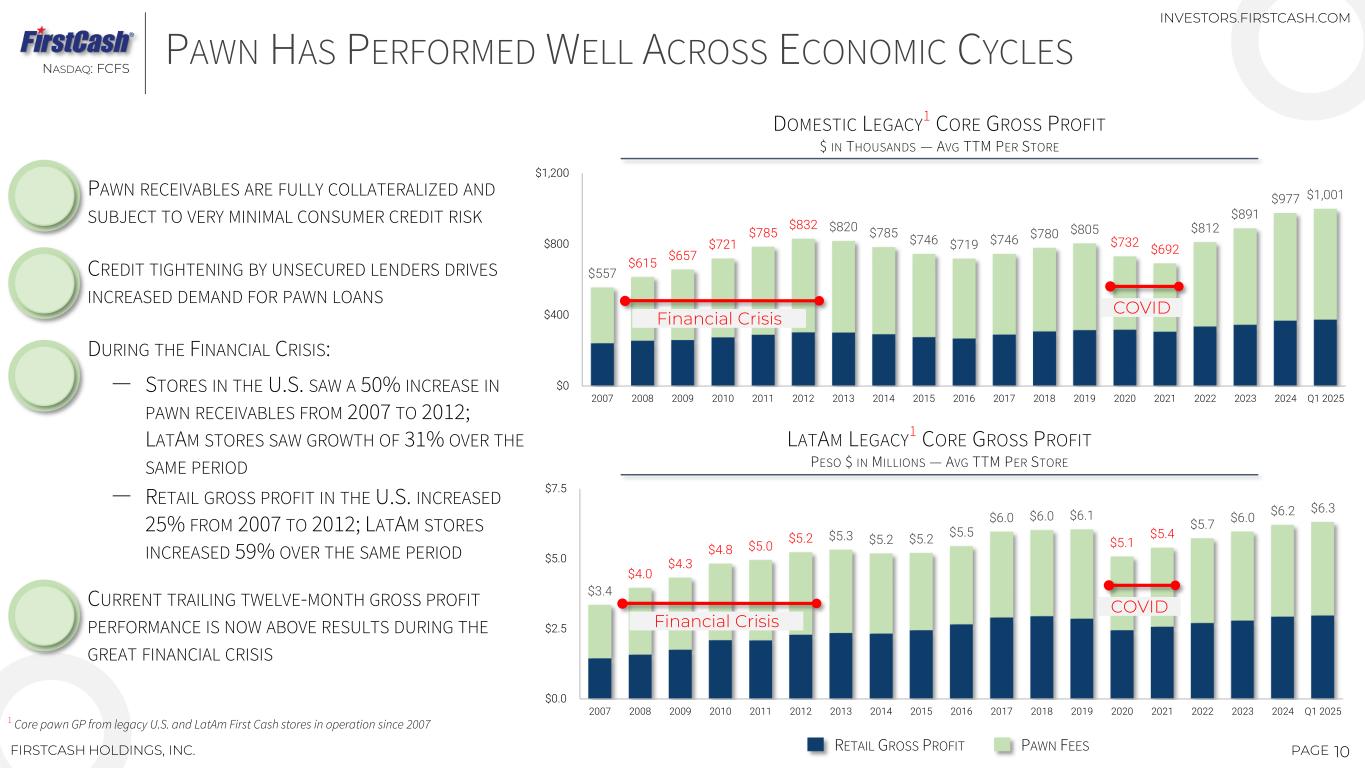 DATA FROM MORE THAN 3,000 PAWN LOCATIONS CONTINUALLY CAPTURED AND REFRESHED FROM MORE THAN 13 MILLION ANNUAL RETAIL TRANSACTIONS ‒ INVENTORY SALES DATABASE PROVIDES REAL-TIME PRICING, TURNOVER AND MARGIN DATA BY MERCHANDISE CATEGORY ‒ PAWN LENDING METRICS INCLUDING COLLATERAL MIX, LOAN-TO-VALUE AND REDEMPTION RATES ARE TRACKED CONTINUALLY PROPRIETARY DATA SETS AND ALGORITHMS ARE USED TO DETERMINE MERCHANDISE VALUE AND OPTIMAL RETAIL PRICING PRODUCT AND CUSTOMER PERFORMANCE ANALYTICS USED TO DRIVE PREDICTABLE YIELDS AND RETAIL SALES MARGINS 9PAGEFIRSTCASH HOLDINGS, INC. NASDAQ: FCFS INVESTORS.FIRSTCASH.COM DATA ANALYTICS DELIVER SCALABLE HIGH-PERFORMING OPERATING METRICS LAS VEGAS, NEVADA