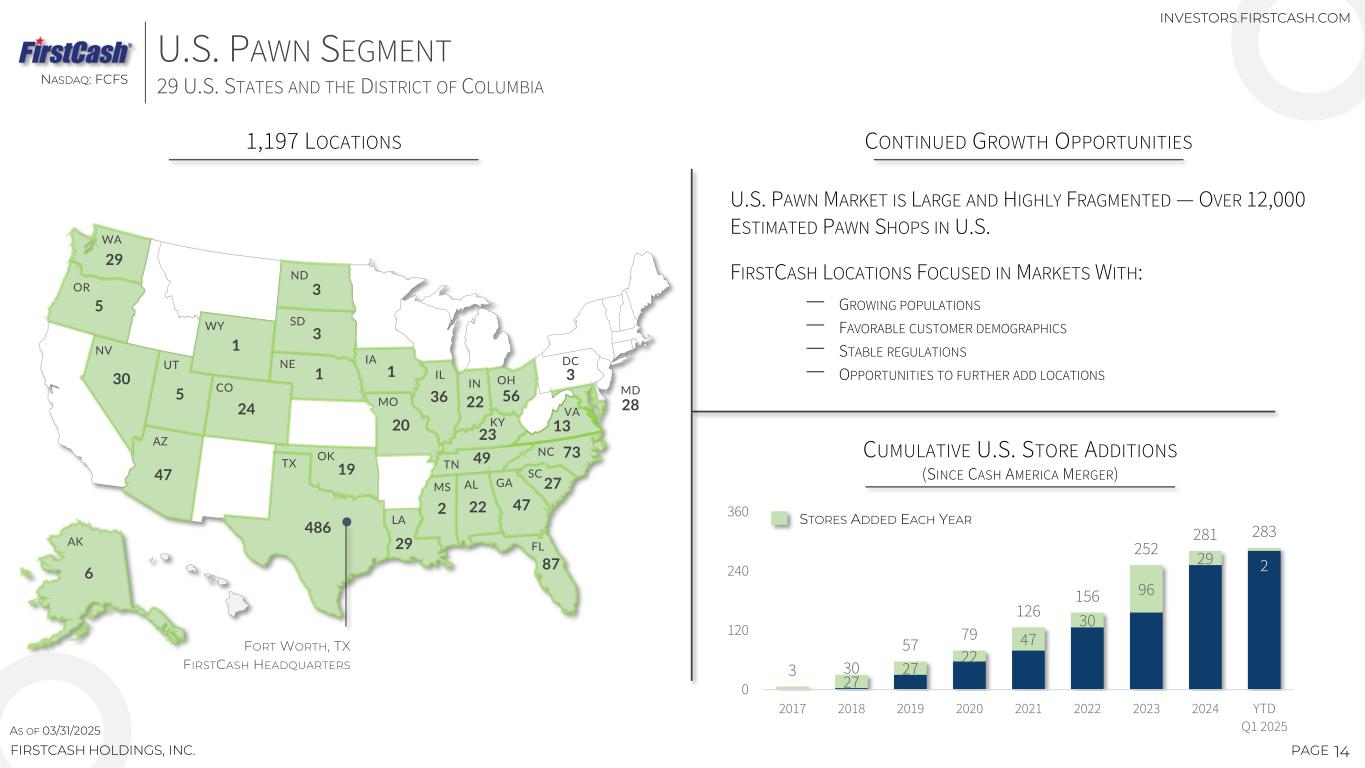 NASDAQ: FCFS 13PAGEFIRSTCASH HOLDINGS, INC. U.S. PAWN SEGMENT 1,197 FULL-SERVICE U.S. LOCATIONS 29 STATES AND THE DISTRICT OF COLUMBIA AS OF 03/31/2025 GRAND PRAIRIE, TEXAS