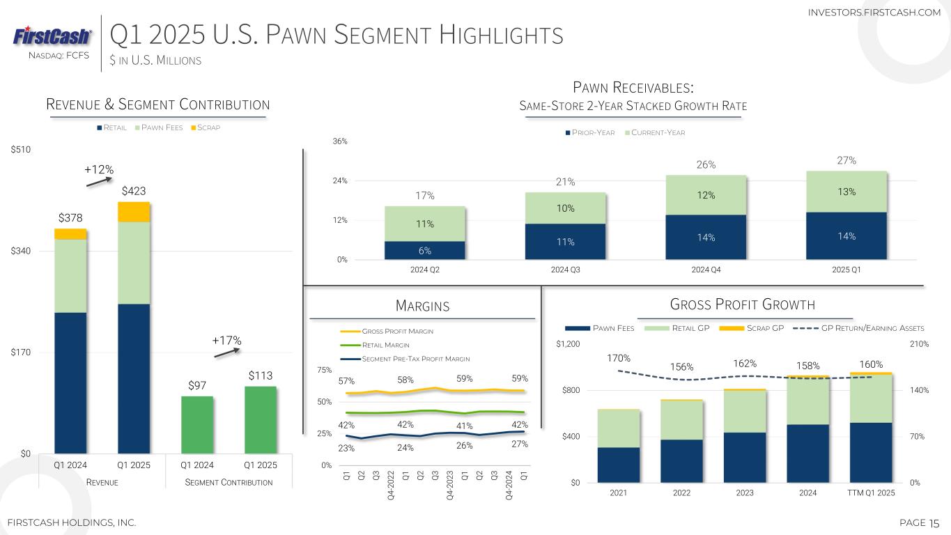 14PAGE U.S. PAWN SEGMENT 29 U.S. STATES AND THE DISTRICT OF COLUMBIA NASDAQ: FCFS FIRSTCASH HOLDINGS, INC. INVESTORS.FIRSTCASH.COM 27 27 22 47 30 96 29 2 3 30 57 79 126 156 252 281 283 0 120 240 360 2017 2018 2019 2020 2021 2022 2023 2024 YTD Q1 2025 U.S. PAWN MARKET IS LARGE AND HIGHLY FRAGMENTED — OVER 12,000 ESTIMATED PAWN SHOPS IN U.S. FIRSTCASH LOCATIONS FOCUSED IN MARKETS WITH: ‒ GROWING POPULATIONS ‒ FAVORABLE CUSTOMER DEMOGRAPHICS ‒ STABLE REGULATIONS ‒ OPPORTUNITIES TO FURTHER ADD LOCATIONS NV AK WA LA UT NE AZ CO TX MO OK IL IN OH GAAL FL KY TN NC VA WY SC 29 30 47 486 6 1 5 24 1 19 36 29 20 22 73 56 4722 87 49 23 13 27 MD 28 DC 3 FORT WORTH, TX FIRSTCASH HEADQUARTERS 2 MS 5 3 3 1 OR ND SD IA 1,197 LOCATIONS CONTINUED GROWTH OPPORTUNITIES AS OF 03/31/2025 STORES ADDED EACH YEAR CUMULATIVE U.S. STORE ADDITIONS (SINCE CASH AMERICA MERGER)