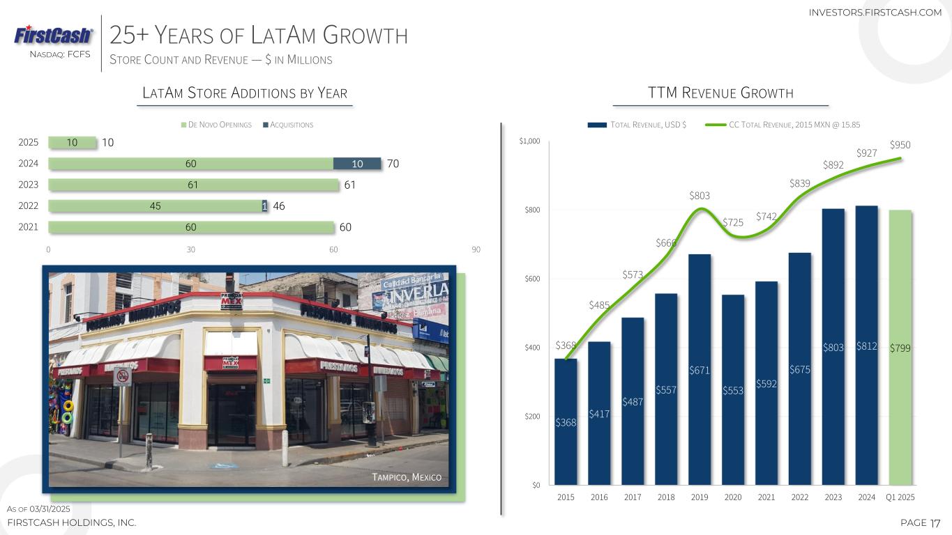 16PAGEFIRSTCASH HOLDINGS, INC. TECAMACHALCO, MEXICO NASDAQ: FCFS INVESTORS.FIRSTCASH.COM LATAM PAWN SEGMENT MORE THAN 1,800 LATIN AMERICA LOCATIONS IN FOUR COUNTRIES o LATIN AMERICAN MARKETS REMAIN RECEPTIVE TO PAWN GIVEN THE HIGH CONCENTRATION OF UNBANKED AND UNDERBANKED CONSUMERS o FIRSTCASH’S WELL-ESTABLISHED LATIN AMERICAN INFRASTRUCTURE AND STRONG CASH FLOWS SUPPORT THE COMPANY’S LONG-TERM GROWTH STRATEGY IN THESE MARKETS o SIGNIFICANT OPPORTUNITY FOR CONTINUED DE NOVO OPENINGS AND ACQUISITIONS ACROSS THE COMPANY’S EXISTING MARKETS IN LATIN AMERICA o FIRSTCASH CONTINUES TO EVALUATE OPPORTUNITIES FOR EXPANSION INTO ADDITIONAL LATIN AMERICA MARKETS EL SALVADOR 18 GUATEMALA 72 COLOMBIA 12 MEXICO OPERATIONS: 1,724 STORES IN ALL 32 STATES 1,724 PAWN LOCATIONS BY COUNTRY CENTRAL + SOUTH AMERICA OPERATIONS: 102 STORES ACROSS 3 COUNTRIES MONTERREY, MX LATAM HEADQUARTERS INCLUDES 9 NEW STORES OPENED IN Q1 2025 AS OF 03/31/2025