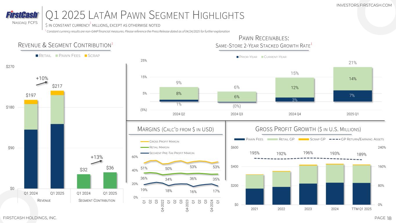 17PAGE NASDAQ: FCFS FIRSTCASH HOLDINGS, INC. 25+ YEARS OF LATAM GROWTH STORE COUNT AND REVENUE — $ IN MILLIONS INVESTORS.FIRSTCASH.COM 60 45 61 60 10 1 10 60 46 61 70 10 0 30 60 90 2021 2022 2023 2024 2025 DE NOVO OPENINGS ACQUISITIONS $368 $417 $487 $557 $671 $553 $592 $675 $803 $812 $799 $368 $485 $573 $666 $803 $725 $742 $839 $892 $927 $950 $0 $200 $400 $600 $800 $1,000 2015 2016 2017 2018 2019 2020 2021 2022 2023 2024 Q1 2025 TOTAL REVENUE, USD $ CC TOTAL REVENUE, 2015 MXN @ 15.85 LATAM STORE ADDITIONS BY YEAR TTM REVENUE GROWTH TAMPICO, MEXICO AS OF 03/31/2025