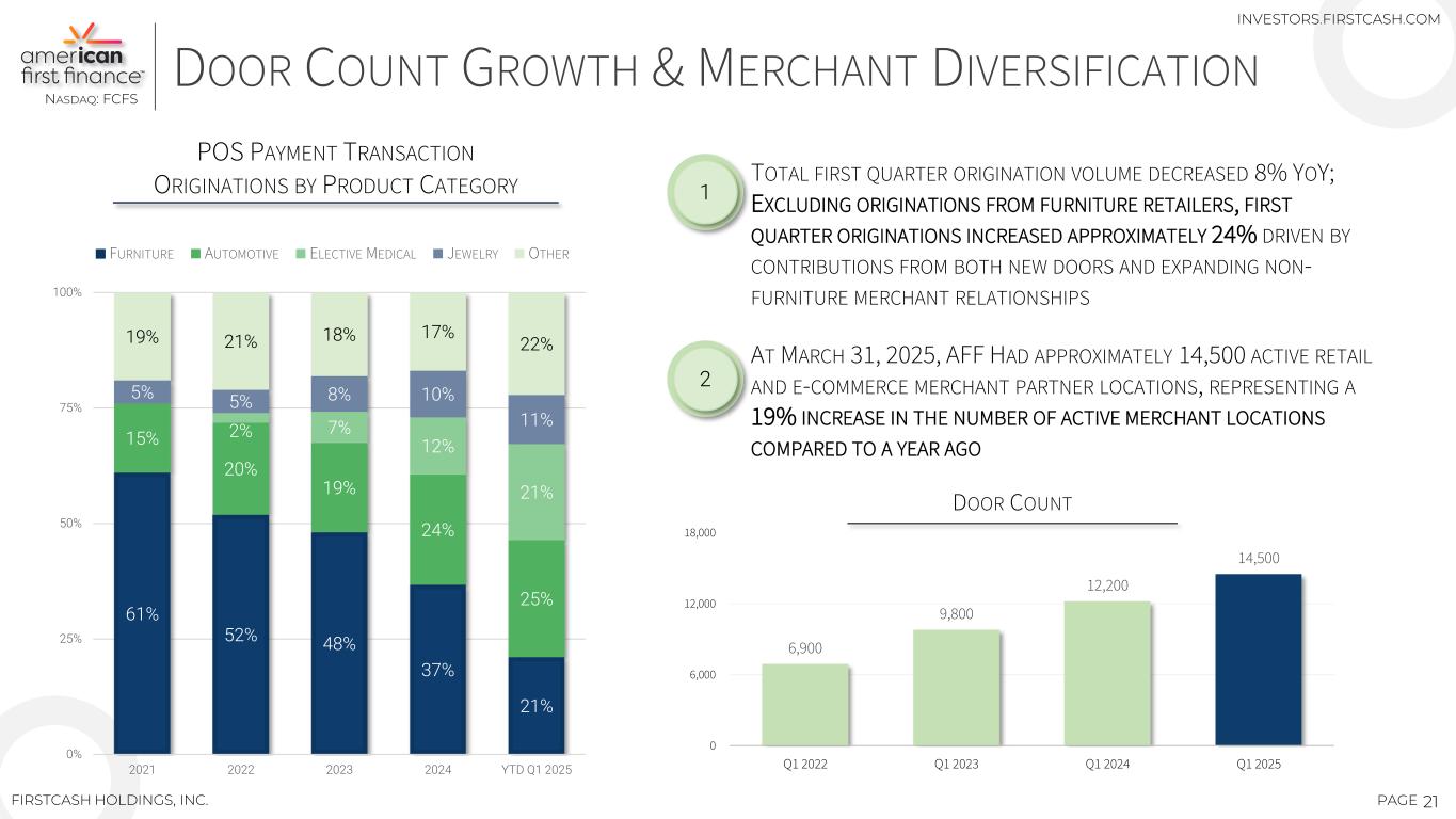 20PAGEFIRSTCASH HOLDINGS, INC. RETAIL POS PAYMENT SOLUTION OVERVIEW PROVIDES PAYMENT SOLUTIONS FOR THIRD-PARTY RETAILERS AND SERVICE PROVIDERS LEASE-TO-OWN BANK LOANSRETAIL INSTALLMENT CUSTOMERS TAKE ITEMS HOME SAME DAY OR ARRANGE FOR DELIVERY TAKE ITEMS HOME — SAME DAY! AVAILABLE AT APPROXIMATELY 14,500 MERCHANT PARTNER LOCATIONS APPLY — IN STORE OR ONLINE DECISIONS ARE ISSUED QUICKLY UPON REVIEW OF APPLICATION INSTANT DECISIONS — TOTAL TRANSPARENCY AUTO-PAY OPTION MANAGED ONLINE BY THE CUSTOMER PAY AS YOU GO INVESTORS.FIRSTCASH.COM AS OF 03/31/2025 NASDAQ: FCFS