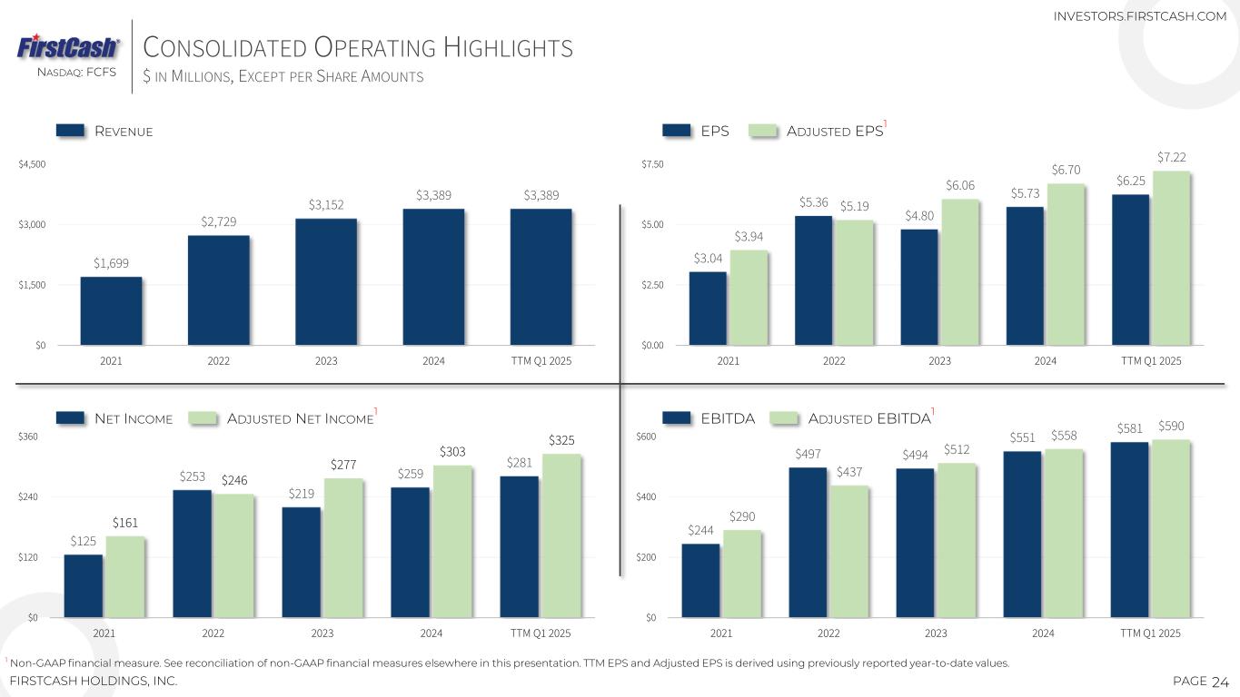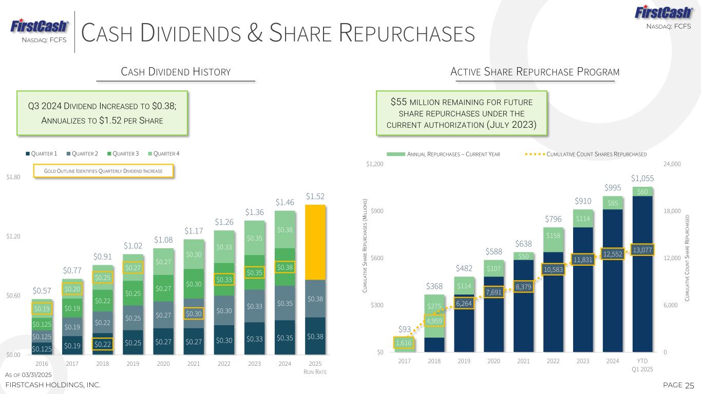 $3.04 $5.36 $4.80 $5.73 $6.25 $3.94 $5.19 $6.06 $6.70 $7.22 $0.00 $2.50 $5.00 $7.50 2021 2022 2023 2024 TTM Q1 2025 $125 $253 $219 $259 $281 $161 $246 $277 $303 $325 $0 $120 $240 $360 2021 2022 2023 2024 TTM Q1 2025 $1,699 $2,729 $3,152 $3,389 $3,389 $0 $1,500 $3,000 $4,500 2021 2022 2023 2024 TTM Q1 2025 $244 $497 $494 $551 $581 $290 $437 $512 $558 $590 $0 $200 $400 $600 2021 2022 2023 2024 TTM Q1 2025 24PAGEFIRSTCASH HOLDINGS, INC. 1 Non-GAAP financial measure. See reconciliation of non-GAAP financial measures elsewhere in this presentation. TTM EPS and Adjusted EPS is derived using previously reported year-to-date values. REVENUE INVESTORS.FIRSTCASH.COM EPS ADJUSTED EPS1 NET INCOME ADJUSTED NET INCOME 1 EBITDA ADJUSTED EBITDA1 CONSOLIDATED OPERATING HIGHLIGHTS $ IN MILLIONS, EXCEPT PER SHARE AMOUNTSNASDAQ: FCFS
