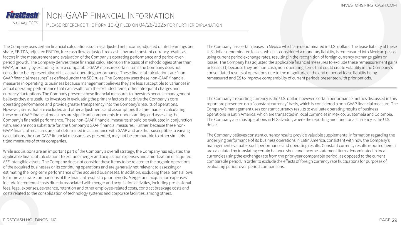 29PAGE NON-GAAP FINANCIAL INFORMATION PLEASE REFERENCE THE FORM 10-Q FILED ON 04/28/2025 FOR FURTHER EXPLANATION NASDAQ: FCFS FIRSTCASH HOLDINGS, INC. The Company uses certain financial calculations such as adjusted net income, adjusted diluted earnings per share, EBITDA, adjusted EBITDA, free cash flow, adjusted free cash flow and constant currency results as factors in the measurement and evaluation of the Company’s operating performance and period-over- period growth. The Company derives these financial calculations on the basis of methodologies other than GAAP, primarily by excluding from a comparable GAAP measure certain items the Company does not consider to be representative of its actual operating performance. These financial calculations are “non- GAAP financial measures” as defined under the SEC rules. The Company uses these non-GAAP financial measures in operating its business because management believes they are less susceptible to variances in actual operating performance that can result from the excluded items, other infrequent charges and currency fluctuations. The Company presents these financial measures to investors because management believes they are useful to investors in evaluating the primary factors that drive the Company’s core operating performance and provide greater transparency into the Company’s results of operations. However, items that are excluded and other adjustments and assumptions that are made in calculating these non-GAAP financial measures are significant components in understanding and assessing the Company’s financial performance. These non-GAAP financial measures should be evaluated in conjunction with, and are not a substitute for, the Company’s GAAP financial measures. Further, because these non- GAAP financial measures are not determined in accordance with GAAP and are thus susceptible to varying calculations, the non-GAAP financial measures, as presented, may not be comparable to other similarly- titled measures of other companies. While acquisitions are an important part of the Company’s overall strategy, the Company has adjusted the applicable financial calculations to exclude merger and acquisition expenses and amortization of acquired AFF intangible assets. The Company does not consider these items to be related to the organic operations of the acquired businesses or its continuing operations and are generally not relevant to assessing or estimating the long-term performance of the acquired businesses. In addition, excluding these items allows for more accurate comparisons of the financial results to prior periods. Merger and acquisition expenses include incremental costs directly associated with merger and acquisition activities, including professional fees, legal expenses, severance, retention and other employee-related costs, contract breakage costs and costs related to the consolidation of technology systems and corporate facilities, among others. The Company has certain leases in Mexico which are denominated in U.S. dollars. The lease liability of these U.S. dollar-denominated leases, which is considered a monetary liability, is remeasured into Mexican pesos using current period exchange rates, resulting in the recognition of foreign currency exchange gains or losses. The Company has adjusted the applicable financial measures to exclude these remeasurement gains or losses (1) because they are non-cash, non-operating items that could create volatility in the Company’s consolidated results of operations due to the magnitude of the end of period lease liability being remeasured and (2) to improve comparability of current periods presented with prior periods. The Company’s reporting currency is the U.S. dollar, however, certain performance metrics discussed in this report are presented on a “constant currency” basis, which is considered a non-GAAP financial measure. The Company’s management uses constant currency results to evaluate operating results of business operations in Latin America, which are transacted in local currencies in Mexico, Guatemala and Colombia. The Company also has operations in El Salvador, where the reporting and functional currency is the U.S. dollar. The Company believes constant currency results provide valuable supplemental information regarding the underlying performance of its business operations in Latin America, consistent with how the Company’s management evaluates such performance and operating results. Constant currency results reported herein are calculated by translating certain balance sheet and income statement items denominated in local currencies using the exchange rate from the prior-year comparable period, as opposed to the current comparable period, in order to exclude the effects of foreign currency rate fluctuations for purposes of evaluating period-over-period comparisons. INVESTORS.FIRSTCASH.COM