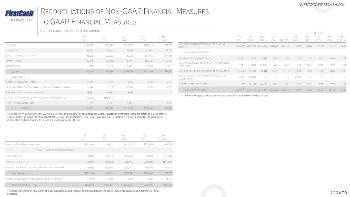 30PAGE RECONCILIATIONS OF NON-GAAP FINANCIAL MEASURES TO GAAP FINANCIAL MEASURESNASDAQ: FCFS Y/E Y/E Y/E Y/E TTM 2021 2022 2023 2024 Q1 2025 NET INCOME $124,909 $253,495 $219,301 $258,815 $281,038 INCOME TAXES 41,593 70,138 73,548 83,961 91,070 DEPRECIATION AND AMORTIZATION 1 45,906 103,832 109,161 104,941 104, 416 INTEREST EXPENSE 32,386 70,708 93,243 105,226 107,279 INTEREST INCOME (696) (1,313) (1,469) (1,935) (2,421) EBITDA $244,098 $496,860 $493,784 $551,008 $581,382 ADJUSTMENTS: MERGER AND ACQUISITION EXPENSES 15,449 3,739 7,922 2,228 2,093 NON-CASH FOREIGN CURRENCY (GAIN) LOSS RELATED TO LEASE LIABILITY 644 (1,329) (2,540) 3,755 4,053 AFF PURCHASE ACCOUNTING ADJUSTMENTS 43,362 50,354 13,968 — — GAIN ON REVALUATION OF CONTINGENT ACQUISITION CONSIDERATION (17,871) (109,549) — — — OTHER EXPENSES (INCOME), NET 949 (2,731) (1,402) 1,446 2,197 ADJUSTED EBITDA $289,631 $437,344 $511,732 $558,437 $589,725 Y/E Y/E Y/E Y/E TTM 2021 2022 2023 2024 Q1 2025 CASH FLOW FROM OPERATING ACTIVITIES $223,304 $469,305 $416,142 $539,958 $544,066 CASH FLOW FROM INVESTING ACTIVITIES: PAWN LOANS, NET 2 (73,340) (35,817) (34,978) (71,999) (77,708) FINANCE RECEIVABLES, NET (5,844) (85,353) (115,442) (139,314) (144,569) PURCHASE OF FURNITURE, FIXTURES, EQUIPMENT AND IMPROVEMENTS (42,022) (35,586) (60,148) (68,245) (54,732) FREE CASH FLOW $102,098 $312,549 $205,574 $260,400 $267,057 MERGER AND ACQUISITION EXPENSES PAID, NET OF TAX BENEFIT 11,872 2,878 6,089 1,706 1,603 ADJUSTED FREE CASH FLOW $113,970 $315,427 $211,663 $262,106 $268,660 1 Includes $49 million, $50 million, $57 million, $57 million and $2 million of amortization expense related to identifiable intangible assets as a result of the AFF Acquisition for the twelve months ended March 31, 2025, and December 31, 2024, 2023, 2022 and 2021, respectively, which is included in the add back of depreciation and amortization to net income used to calculate EBITDA. 2 Includes the funding of new loans net of cash repayments and recovery of principal through the sale of inventories acquired from forfeiture of pawn collateral. PER SHARE 3 Y/E Y/E Y/E Y/E TTM Y/E Y/E Y/E Y/E TTM 2021 2022 2023 2024 Q1 2025 2021 2022 2023 2024 Q1 2025 NET INCOME AND DILUTED EARNINGS PER SHARE, AS REPORTED $124,909 $253,495 $219,301 $258,815 $281,038 $3.04 $5.36 $4.80 $5.73 $6.25 ADJUSTMENTS, NET OF TAX: MERGER AND ACQUISITION EXPENSES 11,872 2,878 6,089 1,706 1,603 0.29 0.06 0.13 0.04 0.03 NON-CASH FOREIGN CURRENCY (GAIN) LOSS RELATED TO LEASE LIABILITY 451 (930) (1,778) 2,627 2,836 0.01 (0.02) (0.04) 0.06 0.06 AFF PURCHASE ACCOUNTING AND OTHER ADJUSTMENTS 37,278 82,432 54,341 38,289 37,974 0.91 1.74 1.19 0.85 0.85 GAIN ON REVALUATION OF CONTINGENT ACQUISITION CONSIDERATION (13,761) (90,035) — — — (0.33) (1.91) — — — OTHER EXPENSES (INCOME), NET 730 (2,103) (1,079) 1,243 1,821 0.02 (0.04) (0.02) 0.02 0.03 ADJUSTED NET INCOME $161,479 $245,737 $276,874 $302,680 $325,272 $3.94 $5.19 $6.06 $6. 70 $7.22 INVESTORS.FIRSTCASH.COM $ IN THOUSANDS, EXCEPT PER SHARE AMOUNTS 3 TTM EPS and Adjusted EPS is derived using previously reported year-to-date values.